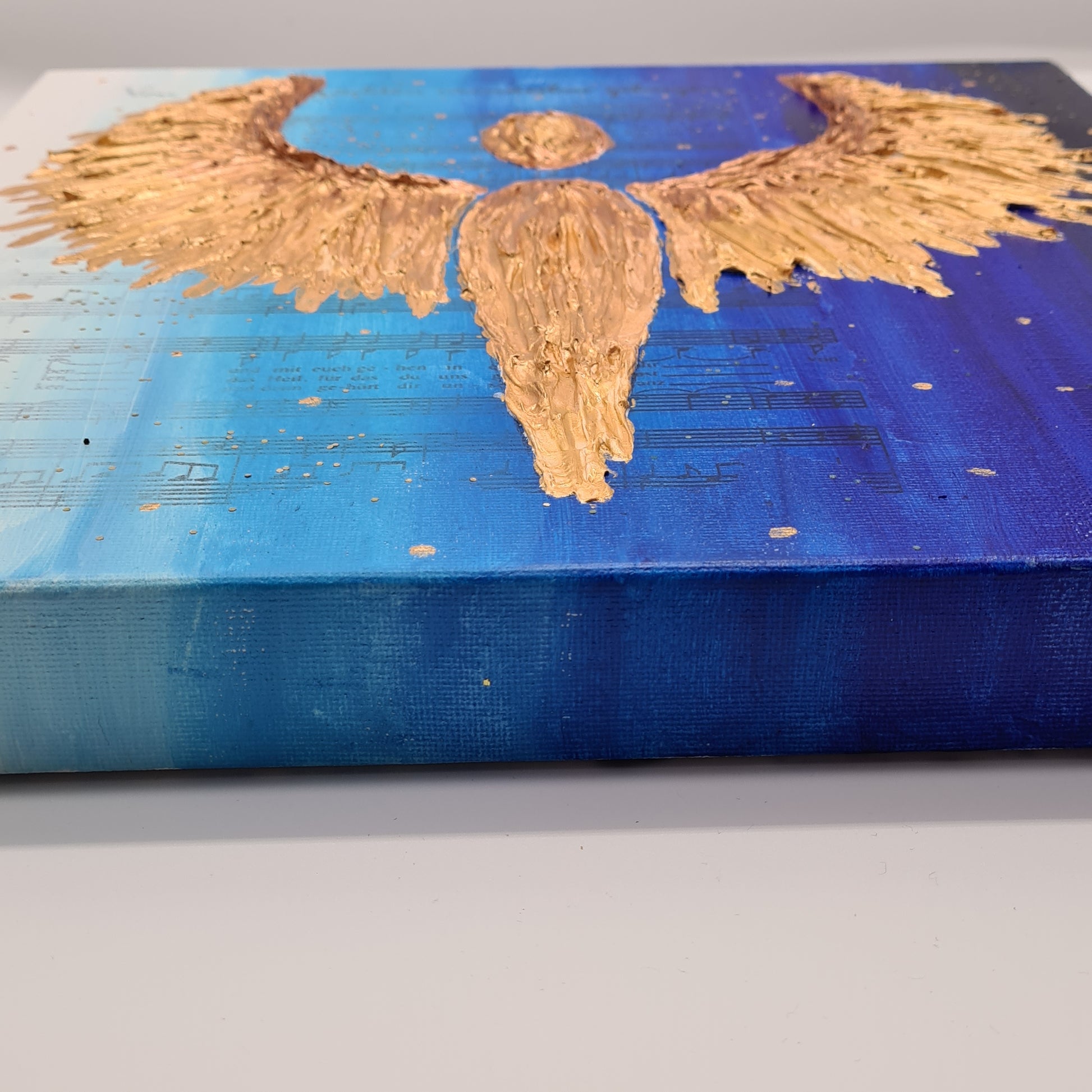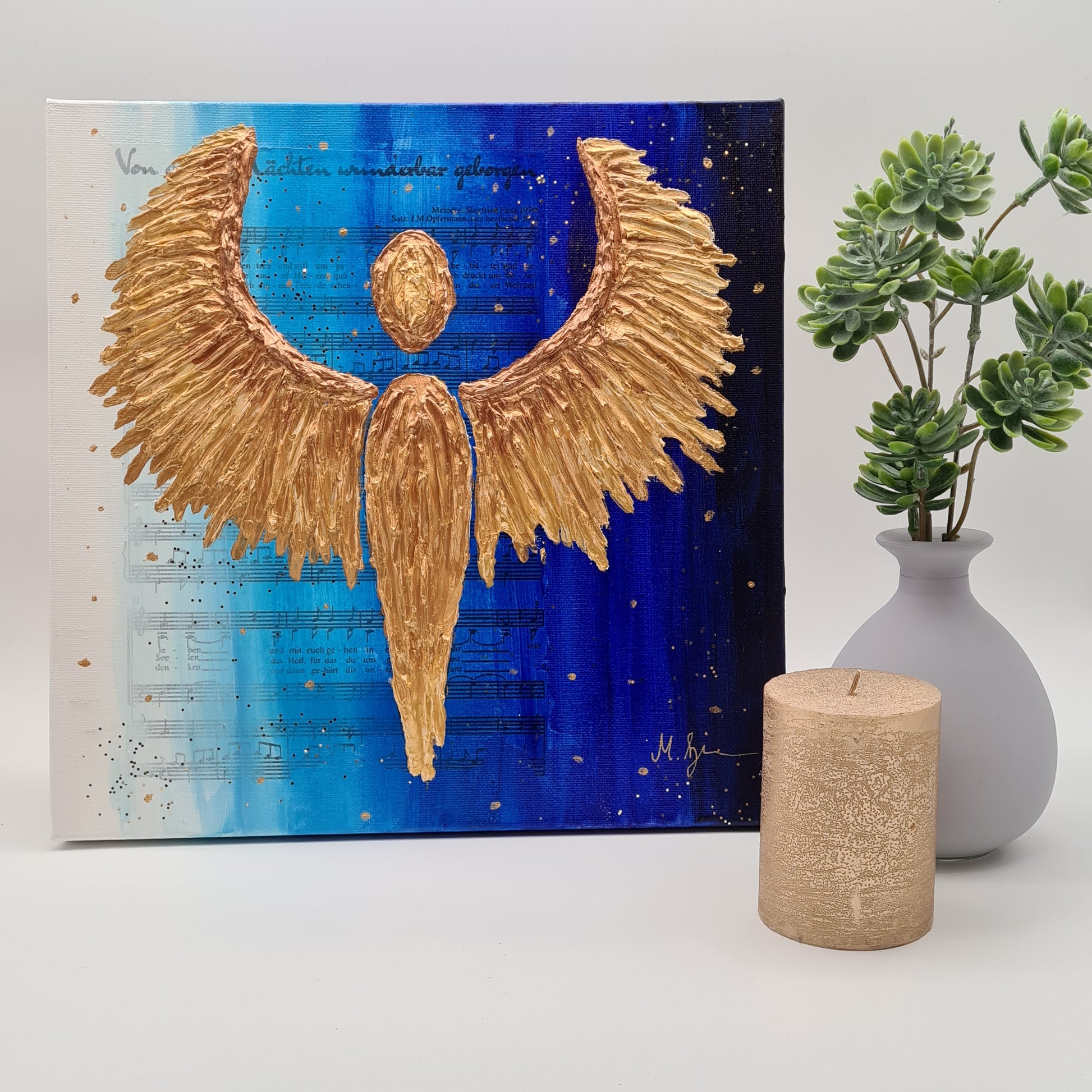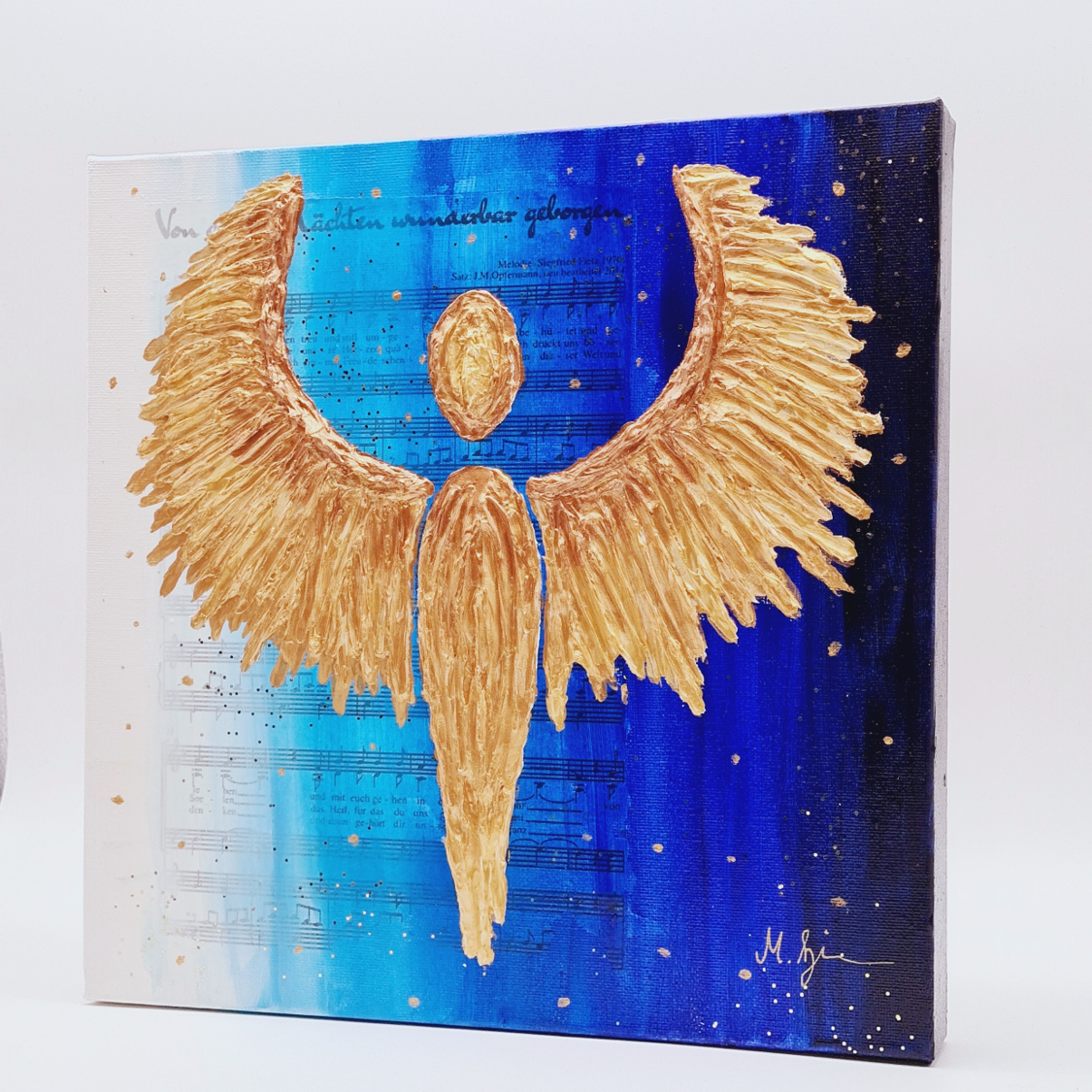 Unsere goldenen, abstrakten Engel auf Leinwand eignen sich perfekt als Geschenk zu jedem Anlass, oder auch einfach nur, um einem lieben Menschen Danke zu sagen oder eine Freude zu machen. Unser modernes Engelbild "Schutzengel" wird dabei unterlegt vom sehr passenden Liedtext "Von guten Mächten wunderbar geborgen" sowie dessen Noten, die dezent durch die Acrylfarbe hindurchschimmern. Jeder Engel ist ein gemaltes Unikat, so dass jedes Bild kleine Abweichungen vorweisen kann.